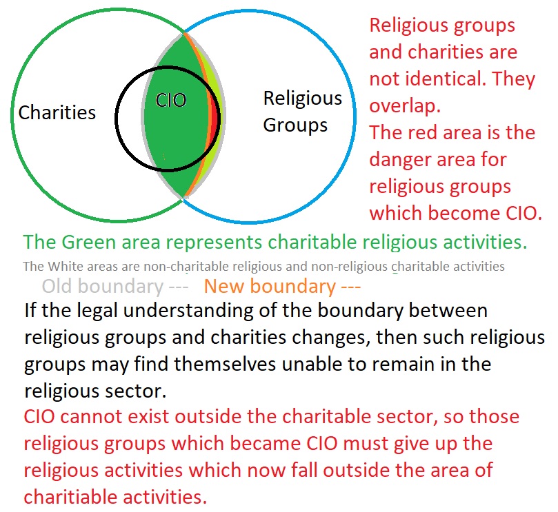 It occurred to me that a Venn type diagramme would be useful here to illustrate the relationships between religious groups, charities and CIO and what would happen if the line between charitable and non-charitable religious activities were to be drawn in a different place.